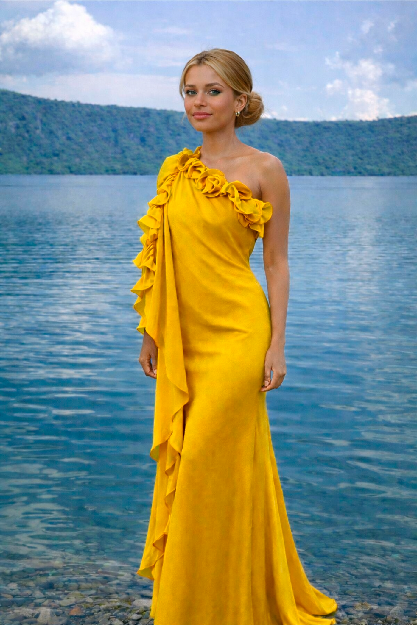 The Macbeth in Merigold is a striking, high‑impact gown crafted for women who embrace color, confidence, and expressive elegance. Its one‑shoulder silhouette creates a refined, elongated line, while the sculptural ruffle detailing adds movement, dimension, and a dramatic focal point. The vibrant marigold hue brings warmth and presence, making this piece ideal for destination events, sunset celebrations, or editorial‑style photoshoots.