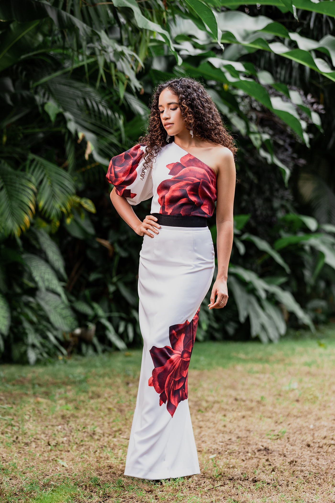 The Poem to a Rose Set is a refined, feminine ensemble designed for women who appreciate elegance rooted in artistry. The sleeveless shirt, adorned with bold red rose motifs, creates a striking visual statement while maintaining a clean, polished silhouette. Paired with a fitted skirt featuring a sculptural sash, the set achieves a harmonious balance between structure, romance, and modern sophistication.