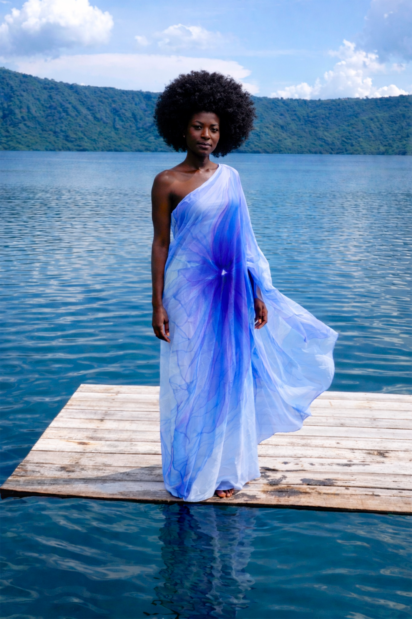 The Purple Veins is a poetic, fluid gown designed for women who embrace elegance with a touch of dreamlike artistry. Its one‑shoulder silhouette creates a refined, elongated line, while the blue‑to‑violet gradient evokes the softness of watercolor strokes or the shifting hues of twilight. The fabric moves gracefully with the breeze, making it ideal for lakeside events, sunset celebrations, or editorial‑style photoshoots.
